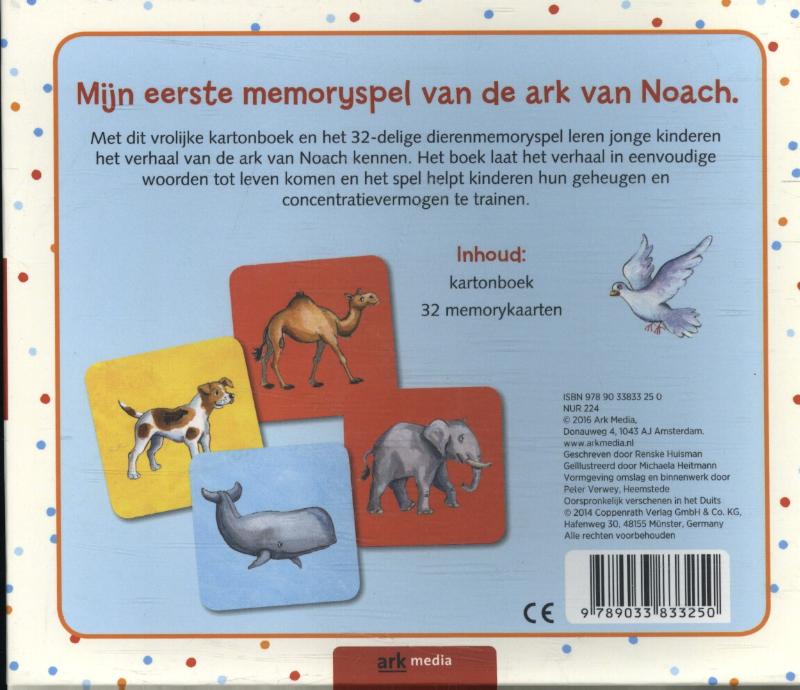 Een origineel cadeautje met het bekende verhaal van de ark van Noach. Stevig kartonboekje met het verhaal in eenvoudige zinnen verteld en kleurrijk geïllustreerd voor peuters. Met een memoryspel van goede kartonkwaliteit met diverse elementen uit het boek: dieren, personen en andere bekende plaatjes. Leuk om voor te lezen aan kinderen vanaf 1 jaar en nog leuker om samen met peuters te spelen.
