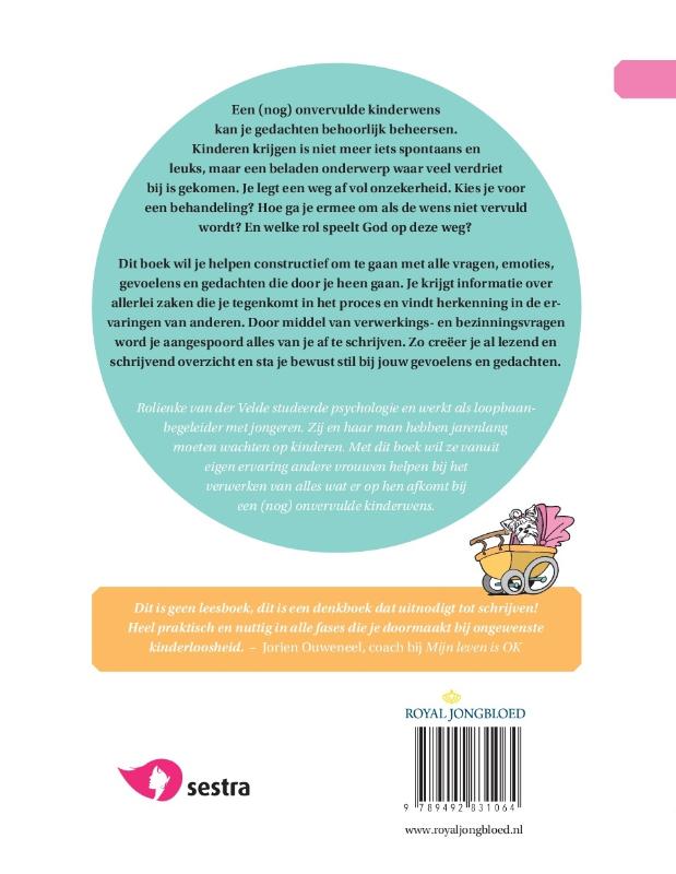 Een kinderwens die (nog) niet vervuld is kan je gedachten behoorlijk beheersen. Dit boek wil je helpen om constructief om te gaan met alle emoties, gevoelens en gedachten die door je heen gaan. Je krijgt informatie over allerlei zaken die je tegenkomt in het proces, zoals de reacties van mensen om je heen, je relatie met God en het behandeltraject. Het boek bevat verwerkings- en bezinningsvragen met schrijfruimte, omdat het enorm kan helpen om van je af te schrijven. Dit alles is gelardeerd met humor, ervaringen en bijbelstudies.