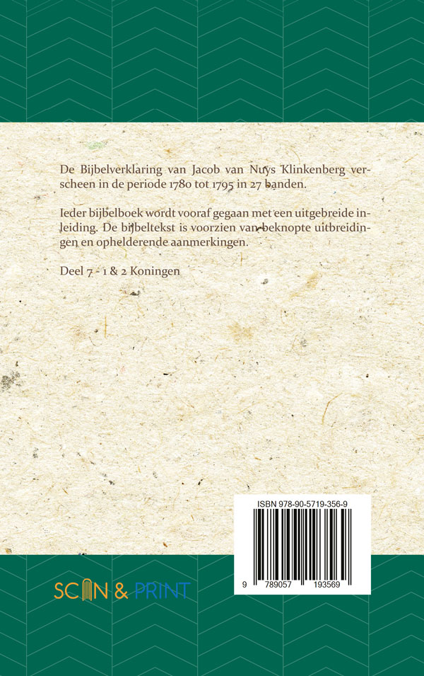 De Bijbelverklaring van Jacob van Nuys Klinkenberg verscheen in de periode 1780 tot 1795 in 27 banden.Ieder bijbelboek wordt vooraf gegaan met een uitgebreide inleiding. De bijbeltekst is voorzien van beknopte uitbreidingen en ophelderende aanmerkingen. Deel 7 – 1 & 2 Koningen