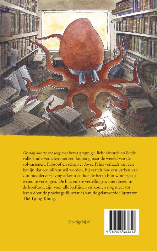 De dag dat de zee weg was bevat grappige, licht absurde en liefdevolle kinderverhalen met een knipoog naar de wereld van de volwassenen. Filosoof en schrijver Awee Prins tekende de verhalen op die hij aan zijn kinderen Dylan en Duider vertelde. Hij beschrijft een konijn dat een olifant wil worden, vertelt hoe een varken van zijn modderverslaving afkomt en hoe de beren de lakens van hun winterslaap schoon weten te houden. De bijzondere dierenverhalen komen tot leven door een dertigtal prachtige tekeningen van gelauwerd illustrator Thé Tjong-Khing.