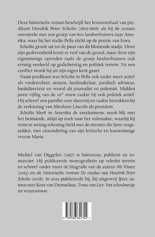 Deze historische roman beschrijft het levensverhaal van predikant Hendrik Peter Scholte (1805-1868) als hij de oceaan oversteekt met een groep van 800 landverhuizers naar Amerika, waar hij het stadje Pella sticht op de prairie van Iowa. Scholte groeit uit tot de paus van dit bloeiende stadje. Door zijn gedrevenheid komt er veel van de grond, maar door zijn eigenzinnige optreden raakt de groep landverhuizers ook ernstig verdeeld op godsdienstig en politiek terrein. Na een conflict wordt hij uit zijn eigen kerk gezet. Naast predikant was Scholte in Pella ook onder meer actief als vrederechter, notaris, landmakelaar, juridisch adviseur, bankdirecteur en vooral als journalist en polemist. Midden jaren vijftig van de 19de eeuw raakte hij ook politiek actief. Hij schreef een pamflet over slavernij en raakte betrokken bij de verkiezing van Abraham Lincoln als president.Scholte bleef in Amerika de exodusmens, nooit blij met het bestaande, altijd op zoek naar het volmaakte, waarbij hij soms te weinig rekening hield met de mensen die hem vergezelden, met uitzondering van zijn kritische en kunstzinnige vrouw Maria. Michiel van Diggelen (1957) is historicus, publicist en romancier. Hij publiceerde monografieën op velerlei terrein en schreef onder meer de biografie van de auteur Ab Visser (2013) en de historische roman De exodus van Hendrik Peter Scholte (2018). In 2022 publiceerde hij, bij uitgeverij IJzer, samen met Kees van Domselaar, Truus van Lier. Van schoolmeisje tot verzetsvrouw.