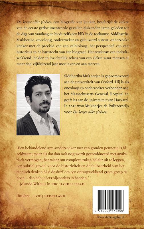 De keizer aller ziektes, een biografie van kanker, beschrijft de ziekte van de eerste gedocumenteerde gevallen duizenden jaren geleden tot de dag van vandaag en biedt zelfs een blik in de toekomst. Siddhartha Mukherjee, oncoloog, onderzoeker en gelauwerd auteur, onderzoekt kanker met de precisie van een celbioloog, het perspectief van een historicus en de hartstocht van een biograaf. Het resultaat: een indrukwekkend, helder en inzichtelijk relaas van een ziekte waar mensen al meer dan vijfduizend jaar mee leven en aan sterven.