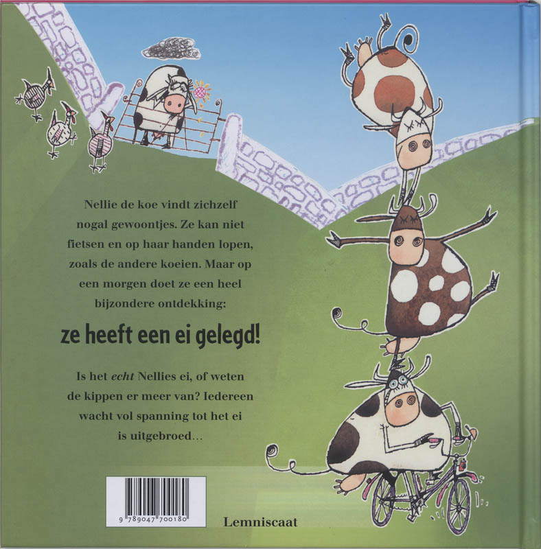 Nellie de koe heeft een ei gelegd! Niet te geloven: een koe die een ei legt. En Nellie is juist zo’n doodgewone koe. Ze kan niet eens fietsen of op haar handen lopen, zoals de andere koeien. Die vertrouwen het zaakje dan ook helemaal niet; daar zullen de kippen wel achter zitten! Iedereen wacht vol spanning tot het ei is uitgebroed. Wordt het een kip? Of toch een koe?