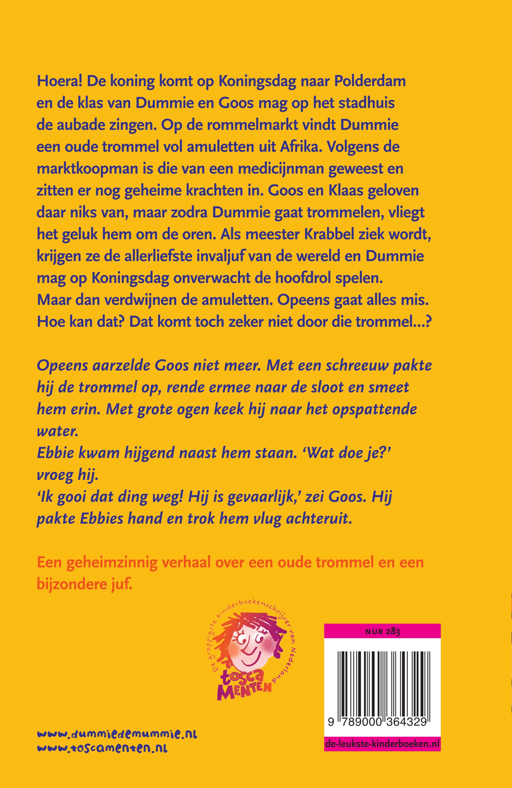 Hoera! De koning komt op Koningsdag naar Polderdam en de klas van Dummie en Goos mag op het stadhuis de aubade zingen. Op de rommelmarkt vindt Dummie een oude trommel vol amuletten uit Afrika. Volgens de marktkoopman is die van een medicijnman geweest en zitten er nog geheime krachten in. Goos en Klaas geloven daar niks van, maar zodra Dummie gaat trommelen, vliegt het geluk hem om de oren. Als meester Krabbel ziek wordt, krijgen ze de allerliefste invaljuf van de wereld en Dummie mag op Koningsdag onverwacht een hoofdrol spelen.