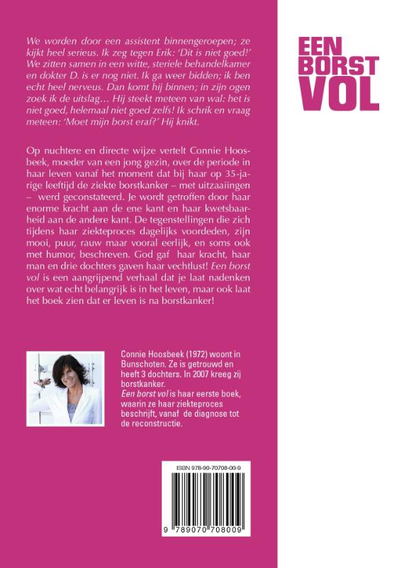 We worden door een assistent binnengeroepen; ze kijkt heel serieus. Ik zeg tegen Erik: ‘Dit is niet goed!’ We zitten samen in een witte, steriele behandelkamer en dokter D. is er nog niet. Ik ben echt heel erg nerveus. Dan komt hij binnen en in zijn ogen zoek ik de uitslag… Hij steekt meteen van wal: het is niet goed, helemaal niet goed zelfs… Borstkanker. Ik schrik en vraag meteen: ‘Moet mijn borst eraf?’ Hij knikt…Op nuchtere en directe wijze vertelt Connie Hoosbeek, moeder van een jong gezin, over de periode in haar leven vanaf het moment dat bij haar op 35 jarige leeftijd borstkanker – met uitzaaiingen – werd geconstateerd. Je wordt getroffen door haar enorme kracht aan de ene kant en de fragiele kwetsbaarheid aan de andere kant. De tegenstellingen die zich tijdens haar ziekteproces dagelijks voordeden zijn mooi, puur, rauw maar vooral eerlijk, voorzien van de soms broodnodige humor, beschreven. Haar geloof gaf haar kracht, haar man en drie dochters gaven haar vechtlust en haar familie en vrienden boden haar hulp! Een borst vol is een aangrijpend verhaal dat je laat nadenken over wat echt belangrijk is in het leven, maar bovenal laat het boek zien dat er leven is na borstkanker!