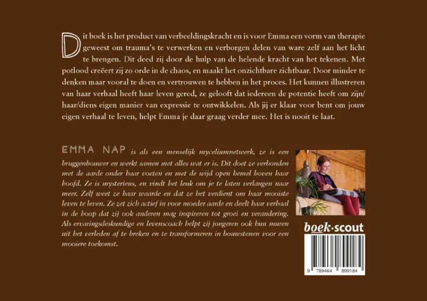 Dit boek is het product van verbeeldingskracht en is voor Emma een vorm van therapie geweest om trauma’s te verwerken en verborgen delen van haar ware zelf aan het licht te brengen. Dit deed zij door de hulp van de helende kracht van het tekenen. Met potlood creëert zij zo orde in de chaos, en maakt het onzichtbare zichtbaar. Door minder te denken maar vooral te doen en vertrouwen te hebben in het proces. Het kunnen illustreren van haar verhaal heeft haar leven gered, ze gelooft dat iedereen de potentie heeft om zijn/haar/diens eigen manier van expressie te ontwikkelen. Als jij er klaar voor bent om jouw eigen verhaal te leven, helpt Emma je daar graag verder mee. Het is nooit te laat.