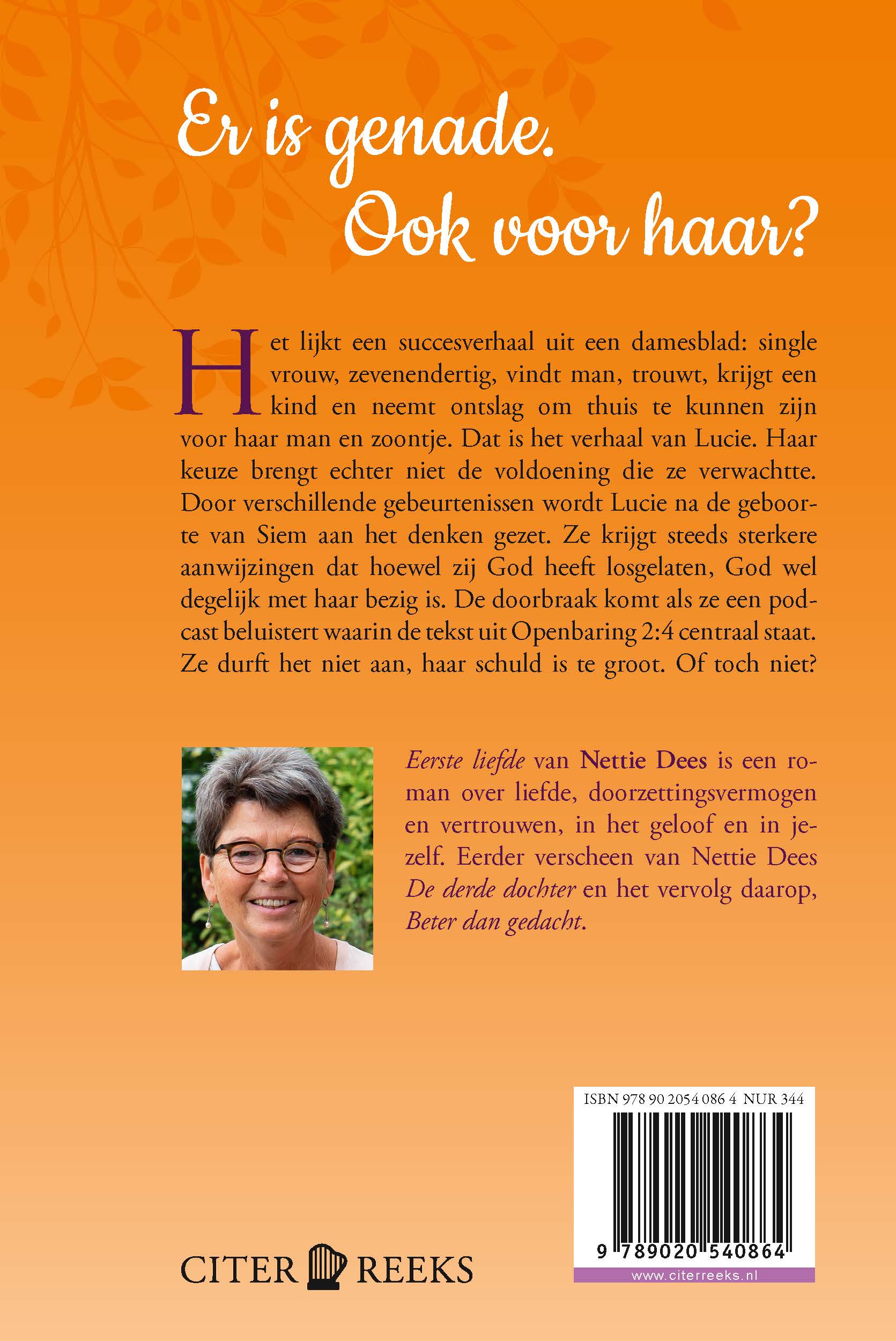‘Eerste liefde’ van Nettie Dees is een meeslepende en herkenbare roman over liefde, doorzettingsvermogen en vertrouwen, in het geloof en in jezelf. Eerder verscheen van Nettie Dees ‘De derde dochter’ en het vervolg daarop, ‘Beter dan gedacht’.