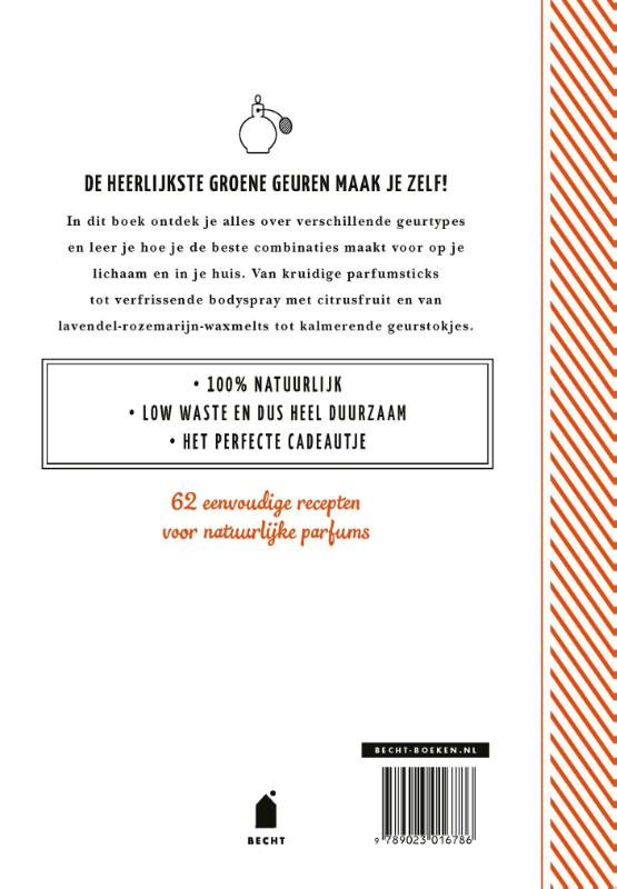 ‘Groene geuren’ bevat ruim 60 recepten, van bodybutter met amandelolie en limoengras tot aloë-verahaarspray en van lavendelkaarsen tot geurzakjes met eucalyptus en kamille. Door de 100% natuurlijke ingrediënten kun je van alle geuren zorgeloos genieten!