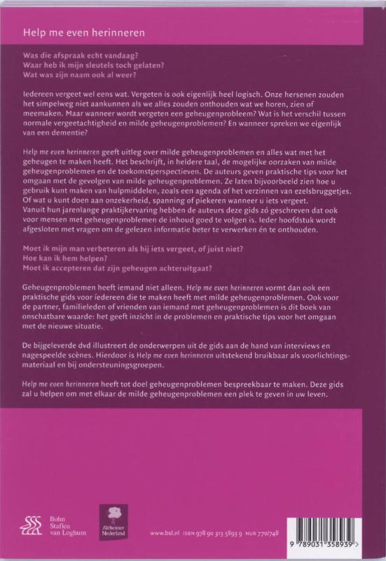 Was die afspraak echt vandaag? Waar heb ik mijn sleutels toch gelaten? Wat was zijn naam ook al weer? Iedereen vergeet wel eens wat. Vergeten is ook eigenlijk heel logisch. Onze hersenen zouden het simpelweg niet aankunnen als we alles zouden onthouden wat we horen, zien of meemaken. Iedereen vergeet wel eens wat. Vergeten is ook eigenlijk heel logisch. Onze hersenen zouden het simpelweg niet aankunnen als we alles zouden onthouden wat we horen, zien of meemaken. Maar wanneer wordt vergeten een geheugenprobleem? Wat is het verschil tussen normale vergeetachtigheid en milde geheugenproblemen? En wanneer spreken we eigenlijk van een dementie? Help me even herinneren geeft uitleg over milde geheugenproblemen en alles wat met het geheugen te maken heeft. Het beschrijft, in heldere taal, de mogelijke oorzaken van milde geheugenproblemen en de toekomstperspectieven. De auteurs geven praktische tips voor het omgaan met de gevolgen van milde geheugenproblemen. Ze laten bijvoorbeeld zien hoe ugebruik kunt maken van hulpmiddelen, zoals een agenda of het verzinnen van ezelsbruggetjes. Of wat u kunt doen aan onzekerheid, spanning of piekeren wanneer u iets vergeet.De online content illustreert de onderwerpen uit de gids aan de hand van interviews en nagespeelde scènes. Hierdoor is Help me even herinneren uitstekend bruikbaar als voorlichtingsmateriaal en bij ondersteuningsgroepen