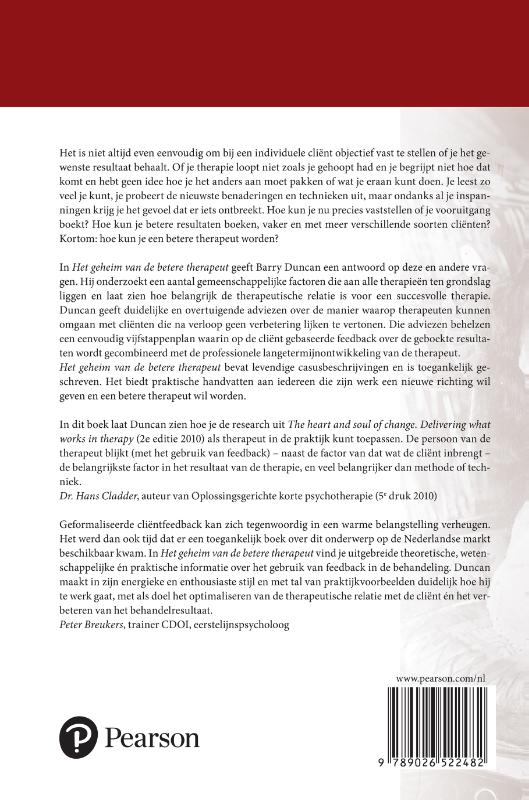 In Het geheim van de betere therapeut geeft Barry Duncan een antwoord op deze en andere vragen. Hij onderzoekt een aantal gemeenschappelijke factoren die aan alle therapieën ten grondslag liggen en laat zien hoe belangrijk de therapeutische relatie is voor een succesvolle therapie. Duncan geeft duidelijke en overtuigende adviezen over de manier waarop therapeuten kunnen omgaan met cliënten die na verloop geen verbetering lijken te vertonen. Die adviezen behelzen een eenvoudig vijfstappenplan waarin op de cliënt gebaseerde feedback over de geboekte resultaten wordt gecombineerd met de professionele langetermijnontwikkeling van de therapeut.
