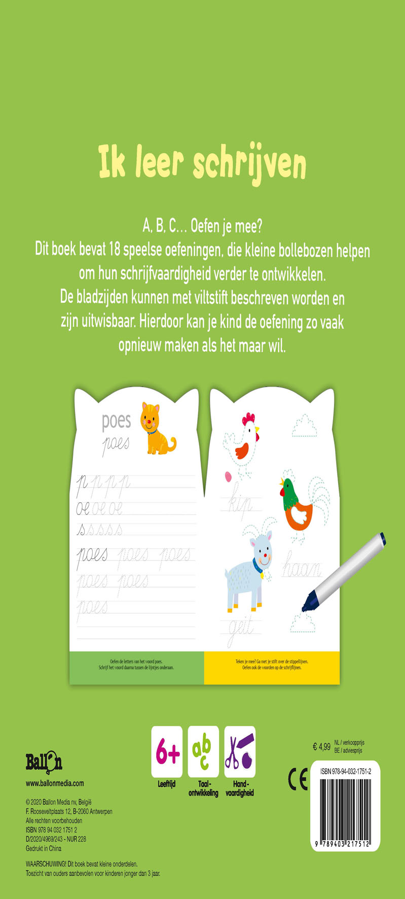A, B, C… Oefen je mee?Dit boek bevat 18 speelse oefeningen, die kleine bollebozen vanaf 6 jaar helpen om hun schrijfvaardigheid verder te ontwikkelen.De bladzijden kunnen met viltstift beschreven worden en zijn uitwisbaar. Hierdoor kan je kind de oefening zo vaak opnieuw maken als het maar wil.