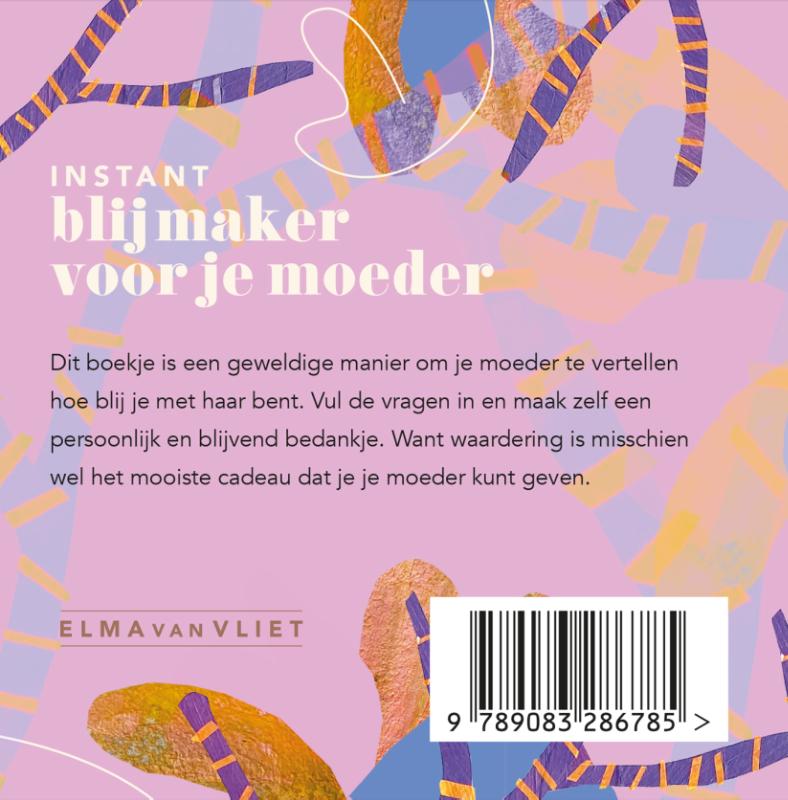 Instant blijmaker voor je moederDit luxe en eigentijdse boekje is een geweldige manier om je moeder te vertellen hoe blij je met haar bent. Vul de vragen in en maak zelf een persoonlijk en blijvend bedankje. Want waardering is misschien wel het mooiste cadeau dat je je moeder kunt geven. Met dit boekje maak je snel een persoonlijk en liefdevol cadeau voor je moeder. Leuk om te maken en bijzonder om te krijgen. Als het boekje af is, gebruik je de wikkel als cadeaupapier. Grote liefde in een klein boekje is hét cadeau dat lang gekoesterd zal worden. + Luxe en eigentijds+ Leuk, snel en liefdevol+ Inclusief cadeaupapier