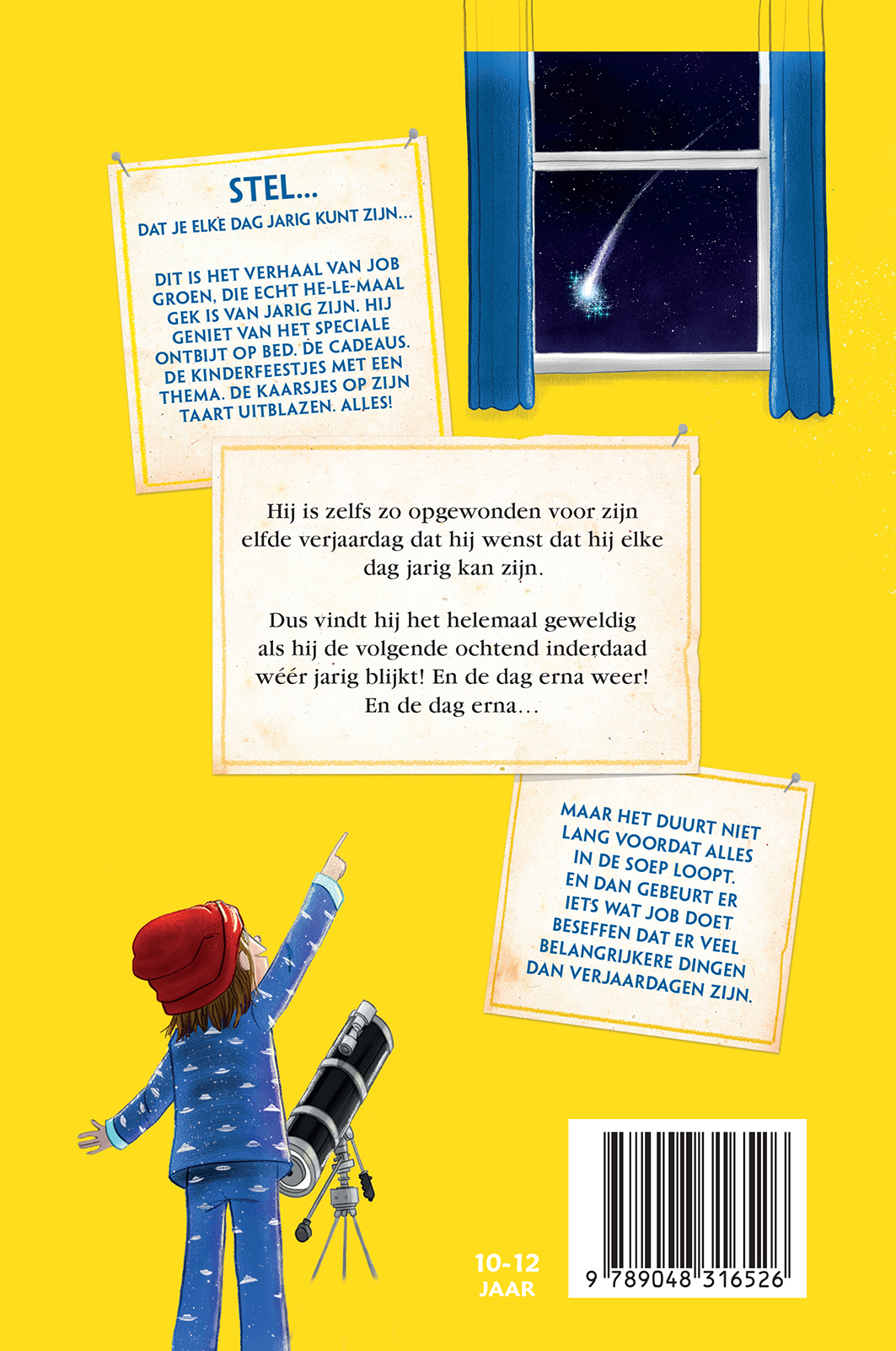 Stel dat je elke dag jarig kan zijn…Dit is het verhaal van Job Groen, die echt he-le-maal gek is van jarig zijn. Hij geniet van het speciale ontbijt op bed. De cadeaus. De kinderfeestjes met een thema. De kaarsjes op zijn taart uitblazen. Alles!Hij is zelfs zo opgewonden voor zijn elfde verjaardag dat hij wenst dat hij elke dag jarig kan zijn.Dus vindt hij het helemaal geweldig als hij de volgende ochtend inderdaad wéér jarig blijkt! En de dag erna weer! En de dag erna…Maar het duurt niet lang voordat alles in de soep loopt. En dan gebeurt er iets wat Job doet beseffen dat er veel belangrijkere dingen dan verjaardagen zijn.