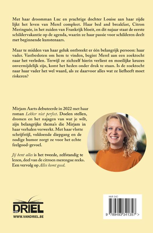 Met haar droomman Luc en prachtige dochter Louise aan haar zijde lijkt het leven van Merel compleet. Haar bed and breakfast, Citron Meringuée, in het zuiden van Frankrijk bloeit, en dit najaar staat de eerste schildervakantie op de agenda, waarin ze haar passie voor schilderen deelt met beginnende kunstenaars. Maar te midden van haar geluk ontbreekt er één belangrijk persoon: haar vader. Vastbesloten om hem te vinden, begint Merel aan een zoektocht naar het verleden. Terwijl ze zichzelf hierin verliest en moeilijke keuzes onvermijdelijk zijn, komt het heden onder druk te staan. Is de zoektocht naar haar vader het wel waard, als ze daarvoor alles wat ze liefheeft moet riskeren?’Jij bent alles’ is het zelfstandig te lezen tweede deel uit de heerlijke Citroen Merengue-serie, een vervolg op Alles komt goed.