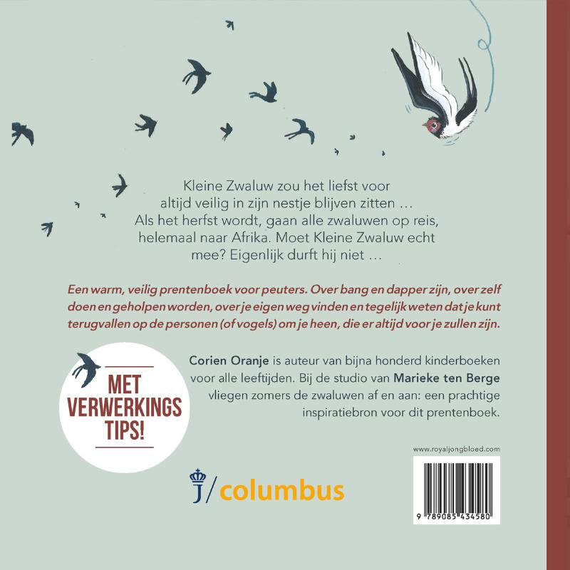 De wereld is groot en spannend als je nog maar net uit het ei komt. Kleine zwaluw zou het liefst voor altijd veilig in zijn nestje blijven zitten, maar aangemoedigd door papa en mama slaat hij op een dag zijn vleugels uit en hij ontdekt hoe leuk het is om te vliegen. Als het herfst wordt, gaan alle zwaluwen op reis, helemaal naar Afrika. Moet kleine zwaluw echt mee? Hij durft eigenlijk niet… Een warm, veilig prentenboek voor peuters over bang en dapper zijn, over zelf doen en geholpen worden, over je eigen weg vinden en tegelijk weten dat je kunt terugvallen op de personen (of vogels) om je heen, die er altijd voor je zullen zijn. De prachtige illustraties in dit prentenboek maken het voorlezen en kijken tot een feest!