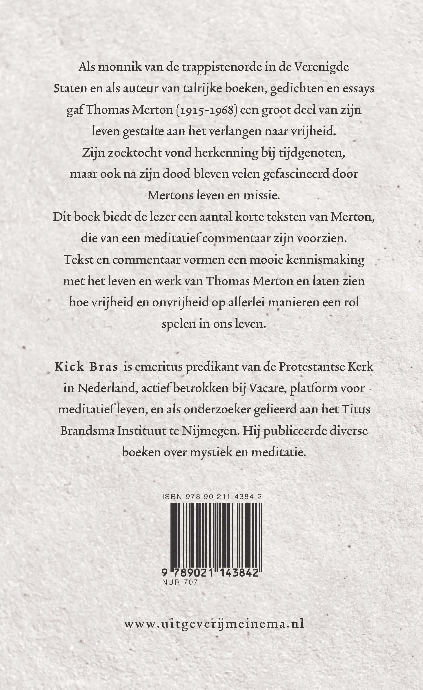 Een kennismaking met het leven en werk van Thomas Merton. Met verlangen naar vrijheid als leidraad.Als monnik van de trappistenorde in de Verenigde Staten en als auteur van talrijke boeken, gedichten en essays gaf Thomas Merton (1915-1968) een groot deel van zijn leven gestalte aan het verlangen naar vrijheid. Zijn zoektocht vond herkenning bij tijdgenoten, maar ook na zijn dood bleven velen gefascineerd door Mertons leven en missie.Dit boek biedt de lezer een aantal korte teksten van Merton, die door Kick Bras van een meditatief commentaar zijn voorzien. Tekst en commentaar laten zien dat vrijheid en onvrijheid op allerlei manieren in ons leven aanwezig zijn en invloed hebben.Kick Bras is emeritus predikant van de Protestantse Kerk in Nederland, actief betrokken bij Vacare, platform voor meditatief leven, en als onderzoeker gelieerd aan het Titus Brandsma Instituut te Nijmegen. Hij publiceerde diverse boeken over mystiek en meditatie.