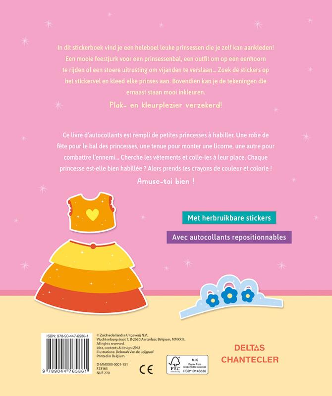 In dit stickerboek vind je een heleboel leuke prinsessen die je zelf kan aankleden! Je kan op elke bladzijde zien wat het meisje moet aantrekken: een mooie feestjurk voor een prinsessenbal, een outfit om op een eenhoorn te rijden of een stoere uitrusting om vijanden te verslaan… Zoek de stickers op het stickervel en plak ze op de juiste plaats. Heeft iedereen een mooie outfit? Dan kan je aan de slag met de kleurplaten!