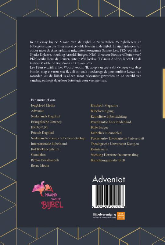In dit essay bij de Maand van de Bijbel 2024 vertellen 25 bijbellezers en bijbelgeleerden over hun meest geliefde teksten in de Bijbel. Er zijn bijdragen van onder meer de Amsterdamse migrantenvoorganger Samuel Lee, PKN-predikant Nynke Dijkstra, theoloog Arnold Huijgen, NBG-directeur Rieuwerd Buitenwerf, PKN-scriba René de Reuver, auteur Wil Derkse, TV-man Andries Knevel en de zusters Madeleine Bouwman en Chiara Bots.Leo Fijen schrijft in het Woord vooraf: ‘Ik hoop van harte dat de lezer van deze bundel mag ervaren wat ik zelf zo vaak meekreeg: de persoonlijke keuze van woorden uit de Bijbel is alleen maar relevanter geworden in de wereld van vandaag en heeft daardoor betekenis voor veel mensen.’