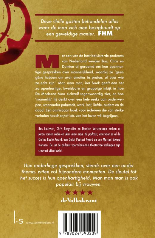 In Man man man, het boek vertellen Domien Verschuuren, Bas Louissen en Chris Bergström – bekend van de podcast Man man man – je alles wat je altijd al wilde weten over mannen maar nooit durfde vragen. Net zoals de podcast bevat dit boek openhartige gesprekken over mannelijkheid. Het biedt een kwetsbare en grappige inkijk in hoe De Moderne Man zichzelf tegenwoordig ziet, en hoe ‘mannelijk’ hij denkt over een hele reeks aan onderwerpen. Daarnaast bevat het boek enkele langere persoonlijke verhalen, waarin de auteurs ‘geen gêne hebben om over emoties te praten of te tonen wie ze echt zijn’. Man man man is met maandelijks meer dan een half miljoen streams een van de meest beluisterde podcasts in Nederland. De theatervoorstellingen die voortkwamen uit de podcast lokten duizenden mensen naar de zalen. Man man man, het boek is de volgende stap in hun succesverhaal.