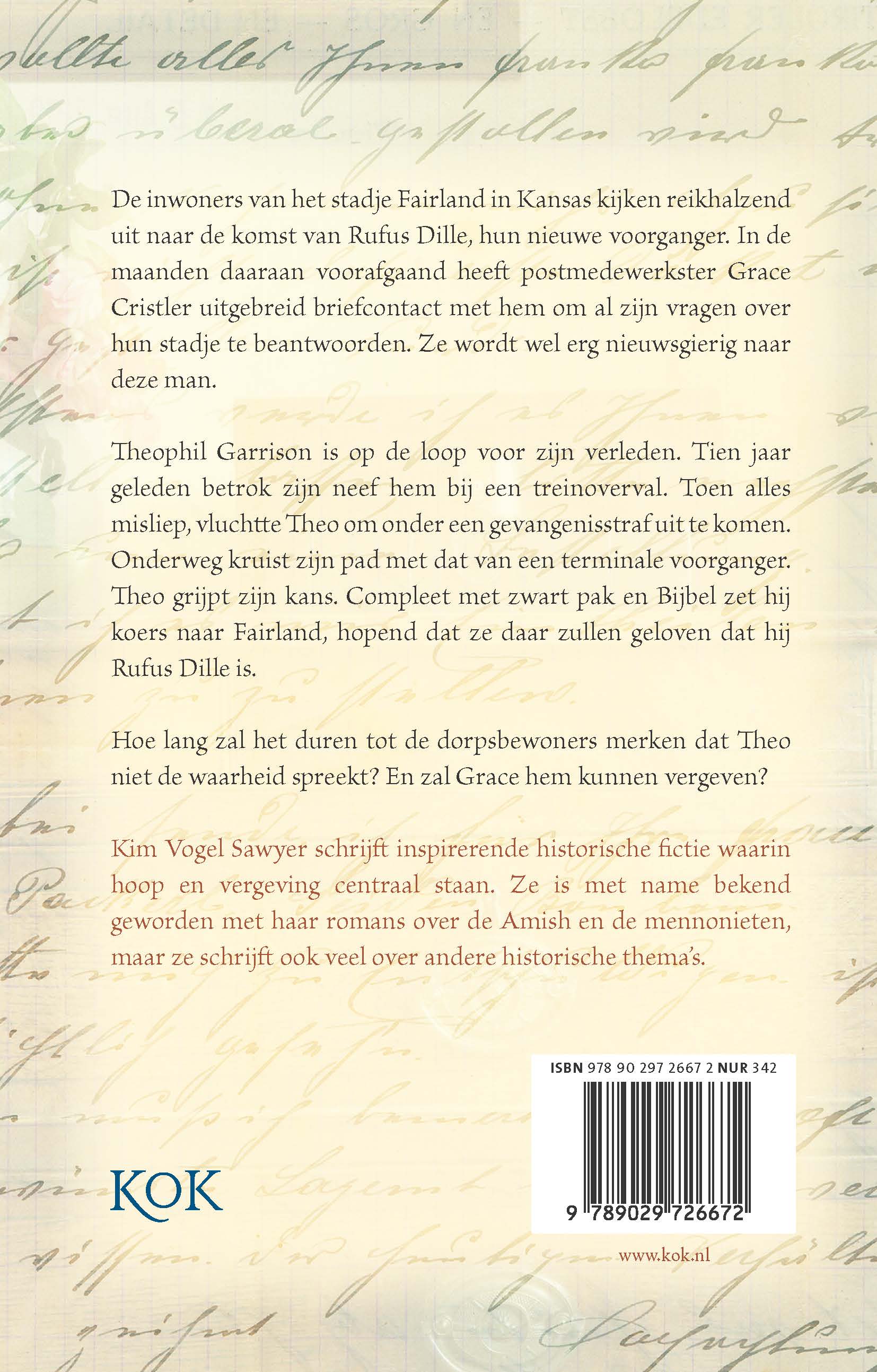 In ‘Een man van zijn woord’ van Kim Vogel Sawyer kijken de inwoners van het stadje Fairland, Kansas, reikhalzend uit naar de komst van hun nieuwe voorganger. In de maanden daaraan voorafgaand, heeft postmedewerkster Grace Cristler uitgebreid briefcontact met hem om al zijn vragen over hun stadje te beantwoorden. Ze kan het niet helpen dat ze wel heel nieuwsgierig wordt naar deze man die zulke mooie brieven schrijft.
