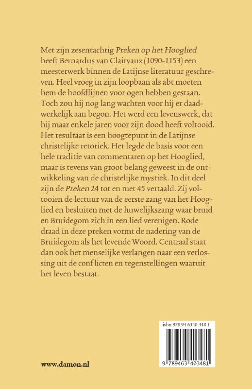 Met zijn zesentachtig ‘Preken op het Hooglied’ heeft Bernardus van Clairvaux (1090-1153) een meesterwerk binnen de Latijnse literatuur geschreven. Heel vroeg in zijn loopbaan als abt moeten hem de hoofdlijnen voor ogen hebben gestaan. Toch zou hij nog lang wachten voor hij er daadwerkelijk aan begon. Het werd een levenswerk, dat hij maar enkele jaren voor zijn dood heeft voltooid. Het resultaat is een hoogtepunt in de Latijnse christelijke retoriek. Het legde de basis voor een hele traditie van commentaren op het Hooglied, maar is tevens van groot belang geweest in de ontwikkeling van de christelijke mystiek. In ‘Bruiloft II’ zijn de preken 24 tot en met 45 vertaald. Zij voltooien de lectuur van de eerste zang van het Hooglied en besluiten met de huwelijkszang waar bruid en Bruidegom zich in een lied verenigen. Centraal staat het menselijke verlangen naar een verlossing uit de conflicten en tegenstellingen waaruit het leven bestaat.