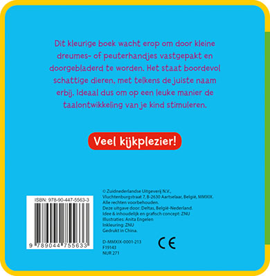 Dit kleurige boek wacht erop om door kleine dreumes- of peuterhandjes vastgepakt en doorgebladerd te worden. Het staat boordevol schattige dieren, met telkens de juiste naam erbij. Ideaal dus om op een leuke manier de taalontwikkeling van je kind stimuler