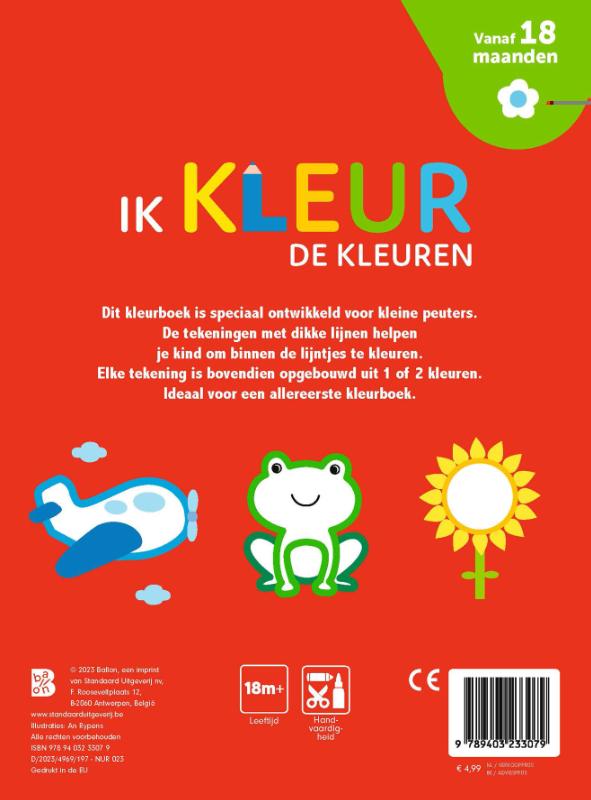 Dit kleurboek is speciaal ontwikkeld voor kleine peuters vanaf 18 maanden. De tekeningen met dikke lijnen helpen je kind om binnen de lijntjes te kleuren. Elke tekening is bovendien opgebouwd uit 1 of 2 kleuren. Ideaal voor een allereerste kleurboek.