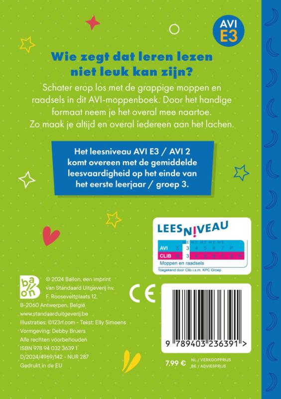 Dit is een van de vele moppen in Mijn AVI-moppenboek, speciaal geschreven voor jonge lezers. Het boek staat vol eenvoudige, grappige moppen die perfect zijn afgestemd op kinderen die net leren lezen en aan het eind van groep 3 zitten. De humor is kindvriendelijk, en de teksten zijn aangepast aan het AVI E3-leesniveau.