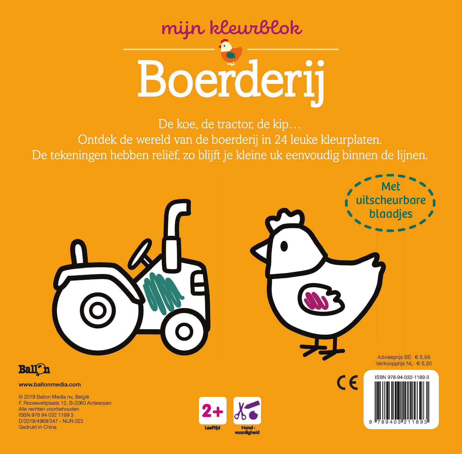 De koe, de tractor, de kip… Ontdek de wereld van de boerderij in 24 leuke kleurplaten.De tekeningen hebben reliëf, zo blijft je kleine uk eenvoudig binnen de lijnen. De tekeningen zijn aangepast aan het niveau van 2-jarigen. De blaadjes zijn eenvoudig uit te scheuren, zodat ze makkelijk cadeau te geven zijn aan mama, papa, familie of vriendjes!