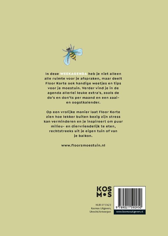 Moestuinieren leidt tot minder stress en meer gezonde eetlust! In deze praktische, luxe weekagenda vind je alle do’s en don’ts voor in de moestuin en allerlei leuke extra’s, zoals eetbare bloemen en verrassende recepten. Je weet nu precies wanneer bijvoorbeeld de pastinaak gezaaid, de aardbei geplant en de framboos gesnoeid moet worden. Op een vrolijke manier laat Floor Korte zien hoe lekker buiten bezig zijn stress kan verminderen en je inspireeert om puur, milieu- en diervriendelijk te eten, rechtstreeks uit je eigen tuin of van je balkon.