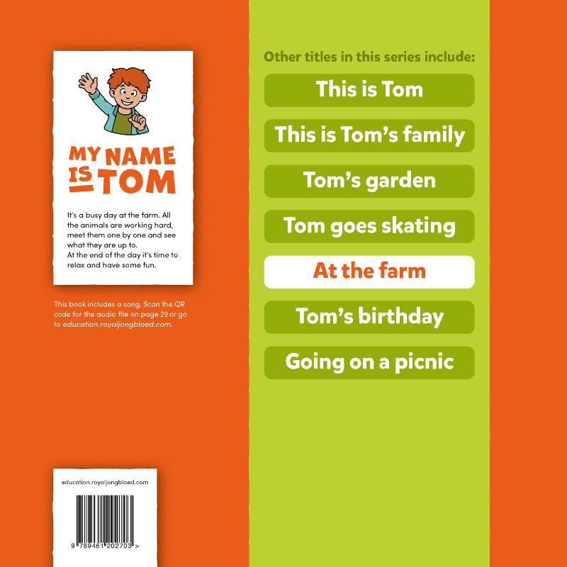 Prentenboek uit de serie My name is Tom.It’s a busy day at the farm. All the animals are working hard,meet them one by one and see what they are up to.At the end of the day it’s time to relax and have some fun.Met QR-code naar een bijpassend lied. De methode My name is Tom is een moderne methode voor het leren van Engels en biedt een volledig doorgaande leerlijn van Engels voor de basisschool van groep 1 t/m 8. De methode is nu volledig herzien en vernieuwd! My name is Tom heeft een flexibele instap, waardoor je op elk moment kunt beginnen met het geven van Engels: zo kun je starten in groep 1, maar bijvoorbeeld ook in groep 5 of groep 7. In totaal kent de methode zeven thema’s, die van groep 1 tot en met groep 8 doorlopen. Zo bieden we de lesstof concentrisch (herhalend) aan. Uiteraard groeien de thema’s mee met de belevingswereld van de leerlingen. Thema’s in groep 1-2:- This is Tom- This is Tom’s family- Tom’s garden- Tom goes skating- At the farm- Tom’s birthday- Going on a picnic