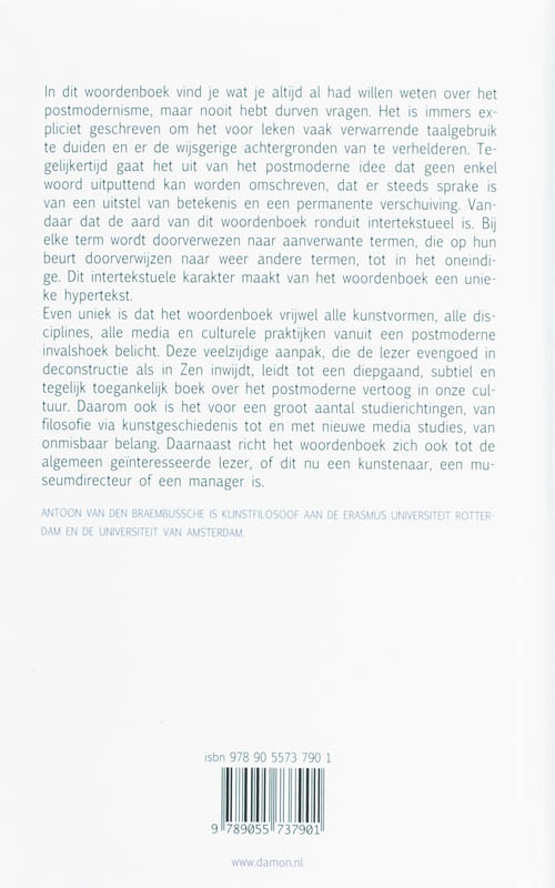 In dit woordenboek vind je wat altijd al had willen weten over het postmodernisme,maar nooit hebt durven vragen. Het is immers expliciet geschreven om het voor leken vaak verwarrende taalgebruik te duiden en er de wijsgerige achtergronden van te verhelderene. Tegelijkertijd gaat het uit van het postmoderne idée dat geen enkel woord uitputtend kan worden omschreven, dat er steeds sprake is van een uitstel van betekenis en een permanente verschuiving. Vandaar dat de aard van dit woordenboek ronduit intertekstueel is. Bij elke term wordt doorverwezen naar aanverwante termen, die op hun beurt doorverwijzen naar weer andere termen, tot in het oneindige. Dit intertekstuele karakter maakt van het woordenboek een unieke hypertekst.