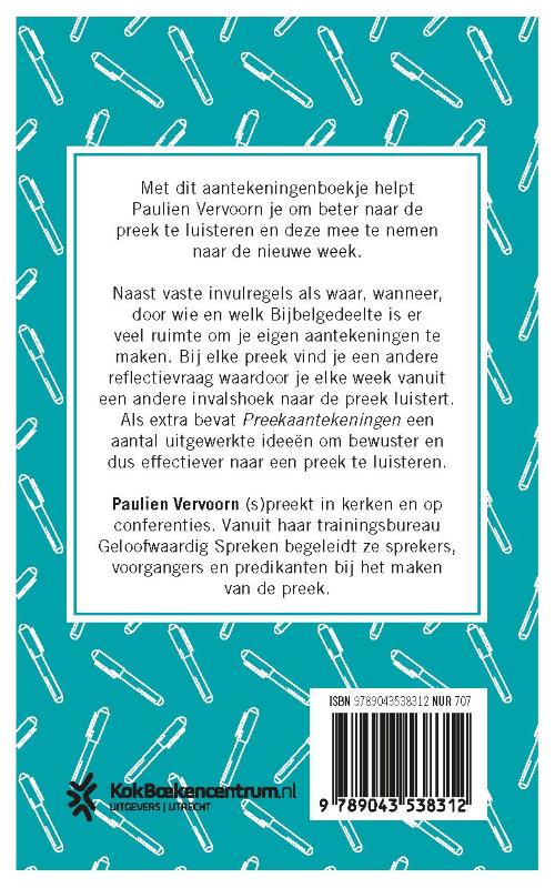 Preektaantekeningen van Paulien Vervoorn is een aantekeningenboek dat helpt om beter naar de preek te luisteren en deze vast te houden. Naast vaste invulregels als datum, plaats, voorganger en preektekst is er ruimte om aantekeningen te maken en gebedspunten te inventariseren. Daarnaast, en daarmee is dit prekenschrijfboek uniek, bevat Preekaantekeningen tal van adviezen voor het luisteren naar een preek en mooie quotes over preken, kerkdiensten en hoorders.