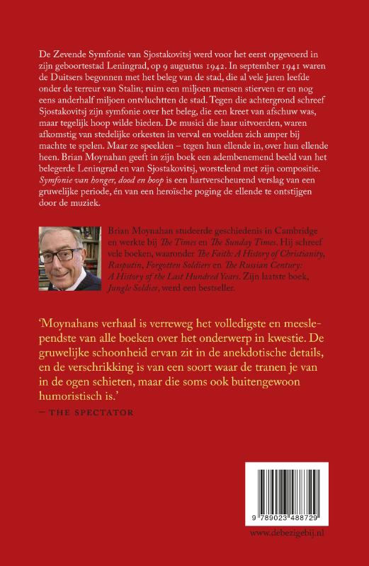 De Zevende Symfonie van Sjostakovitsj werd voor het eerst opgevoerd in zijn geboortestad Leningrad, op 9 augustus 1942. In september 1941 waren de Duitsers begonnen met het beleg van de stad, die al vele jaren leefde onder de terreur van Stalin; ruim een miljoen mensen stierven er en nog eens anderhalf miljoen ontvluchtten de stad. Tegen die achtergrond schreef Sjostakovitsj zijn symfonie over het beleg, die een kreet van afschuw was, maar tegelijk hoop wilde bieden. De musici die haar uitvoerden, waren afkomstig van stedelijke orkesten in verval en voelden zich amper bij machte te spelen. Maar ze speelden tegen hun ellende in, over hun ellende heen. Brian Moynahan geeft in zijn boek een adembenemend beeld van het belegerde Leningrad en van Sjostakovitsj, worstelend met zijn compositie. Symfonie van honger, dood en hoop is een hartverscheurend verslag van een gruwelijke periode, én van een heroïsche poging de ellende te ontstijgen door de muziek.