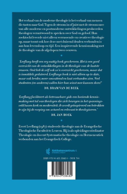 Tasten naar God van Evert Leeflang is een boeiende introductie op de samenhang van theologie en cultuur in de afgelopen twee eeuwen. Het verhaal van de moderne theologie is het verhaal van mensen die tasten naar God. Tegen de stroom in of juist met de stroom mee van alle moderne en postmoderne ontwikkelingen probeerden theologen verhelderend te spreken over God en geloof. Hun zoektocht leverde niet alleen verrassend boeiende en creatieve theologie op, maar toont ook hoe deze met duizend draden verbonden is aan hun levensloop en tijd.