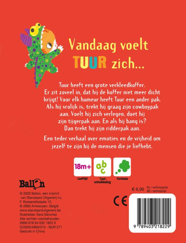 In ’Vandaag voelt Tuur zich…’ heeft de kleine Tuur een verkleedoutfit voor elk moment van de dag. Zo doet hij zijn ezelspak aan als hij koppig is. Als hij verlegen is, doet hij zijn tijgerpak aan voor extra moed en als hij bang is draagt hij een ridderharnas. Maar ’s avonds in de zetel, lekker knus tussen mama en papa in, heeft hij geen verkleedkleren nodig. Dan kan hij helemaal zichzelf zijn. Een teder verhaal over emoties en de vrijheid om jezelf te zijn bij de mensen die je liefhebt. Dit kartonboek met een verhaaltje zal de harten van de allerkleinsten veroveren. Dankzij de dikte en uitkap kun je het boek rechtop zetten als een echt personage. Tuur is een typische peuter: soms ondeugend, soms onzeker, maar altijd vertederend. Tuur maakt de typische peuteruitdagingen bespreekbaar én speels.