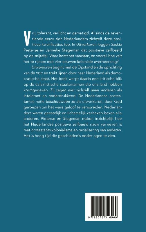 Uitverkoren begint met de Opstand en de oprichting van de voc en trekt lijnen door naar Nederland als democratische staat. Het boek werpt daarin een kritische blik op de calvinistische staatsmannen die ons land hebben vormgegeven. Zij zagen niet zichzelf maar anderen als intolerant en onderdrukkend. De Nederlandse protestantse natie beschouwden ze als uitverkoren, door God geroepen om het ware geloof te verspreiden. Nederlanders waren geestelijk en lichamelijk verheven boven alle anderen. Pieterse en Stegeman maken inzichtelijk hoe het Nederlandse positieve zelfbeeld nauw verweven is met protestants kolonialisme en racialisering van anderen. Het is hoog tijd die geschiedenis onder ogen te zien.
