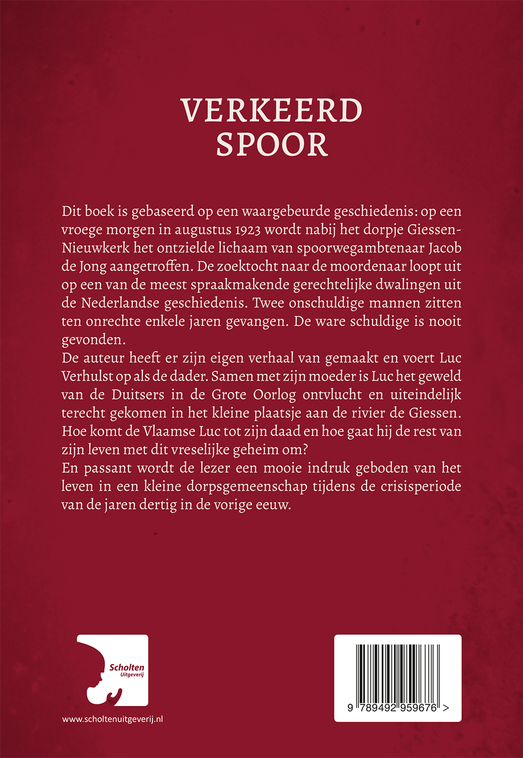 Dit boek is gebaseerd op een waargebeurde geschiedenis: op een vroege morgen in augustus 1923 wordt nabij het dorpje Giessen-Nieuwkerk hetontzielde lichaam van spoorwegambtenaar Jacob de Jong aangetroffen. De zoektocht naar de moordenaar loopt uit op een van de meest spraakmakende gerechtelijke dwalingen uit de Nederlandse geschiedenis. Twee onschuldigemannen zitten ten onrechte enkele jaren gevangen. De ware schuldige is nooit gevonden.De auteur heeft er zijn eigen verhaal van gemaakt en voert Luc Verhulst op als de verdachte. Samen met zijn moeder is Luc het geweld van de Duitsers in de Grote Oorlog ontvlucht en uiteindelijk terechtgekomen in het kleine plaatsje aan de rivier de Giessen. Hoe komt de Vlaamse Luc tot zijn daad en hoe gaat hij de rest van zijn leven met dit vreselijke geheim om?En passant wordt de lezer een mooie indruk geboden van het leven in eenkleine dorpsgemeenschap tijdens de crisisperiode van de jaren dertig in de vorige eeuw.
