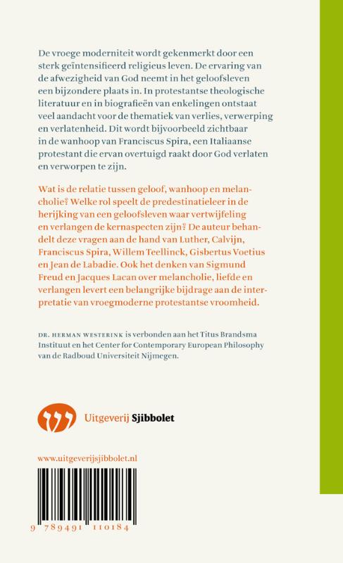 De vroege moderniteit wordt gekenmerkt door een sterk geïntensifieerd religieus leven. De ervaring van de afwezigheid van God neemt in het geloofsleven een bijzondere plaats in. In protestantse theologische literatuur en in biografieën van enkelingen ontstaat veel aandacht voor de thematiek van verlies, verwerping en verlatenheid. Dit wordt bijvoorbeeld zichtbaar in de wanhoop van Franciscus Spira, een Italiaanse protestant die ervan overtuigd raakt door God verlaten en verworpen te zijn.Wat is de relatie tussen geloof, wanhoop en melancholie? Welke rol speelt de predestinatieleer in de herijking van een geloofsleven waar vertwijfeling en verlangen de kernaspecten zijn? De auteur behandelt deze vragen aan de hand van Luther, Calvijn, Franciscus Spira, Willem Teellinck, Gisbertus Voetius en Jean de Labadie. Ook het denken van Sigmund Freud en Jacques Lacan over melancholie, liefde en verlangen levert een belangrijke bijdrage aan de interpretatie van vroegmoderne protestantse vroomheid. Dr. Herman Westerink is verbonden aan het Titus Brandsma Instituut en het Center for Contemporary European Philososophy van de Radboud Universiteit Nijmegen.