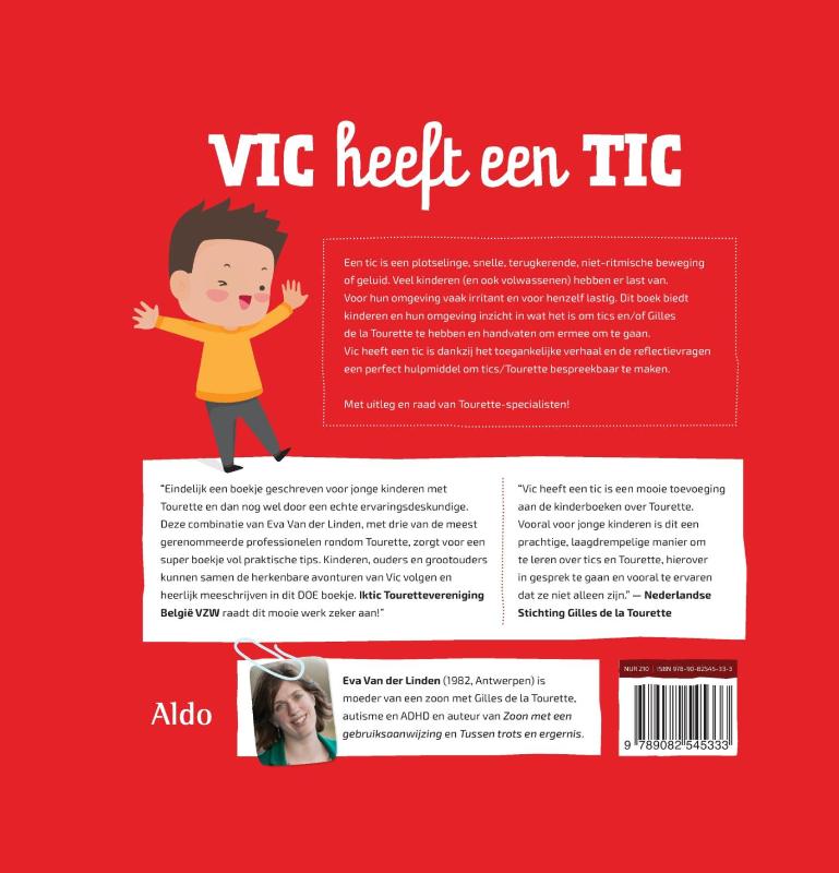 Een tic is een plotselinge, snelle, terugkerende, niet-ritmische bewegingof geluid. Veel kinderen (en ook volwassenen) hebben er last van.Voor hun omgeving vaak irritant en voor henzelf lastig. Dit boek biedtkinderen en hun omgeving inzicht in wat het is om tics en/of Gillesde la Tourette te hebben en handvaten om ermee om te gaan.Vic heeft een tic is dankzij het toegankelijke verhaal en de refl ectievrageneen perfect hulpmiddel om tics/Tourette bespreekbaar te maken.Met uitleg en raad van Tourette-specialisten!”Eindelijk een boekje geschreven voor jonge kinderen metTourette en dan nog wel door een echte ervaringsdeskundige.Deze combinatie van Eva Van der Linden, met drie van de meestgerenommeerde professionelen rondom Tourette, zorgt voor eensuper boekje vol praktische tips. Kinderen, ouders en grootouderskunnen samen de herkenbare avonturen van Vic volgen enheerlijk meeschrijven in dit DOE boekje. Iktic TouretteverenigingBelgië VZW raadt dit mooie werk zeker aan!””Vic heeft een tic is een mooie toevoegingaan de kinderboeken over Tourette.Vooral voor jonge kinderen is dit eenprachtige, laagdrempelige manier omte leren over tics en Tourette, hieroverin gesprek te gaan en vooral te ervarendat ze niet alleen zijn.” – NederlandseStichting Gilles de la Tourette