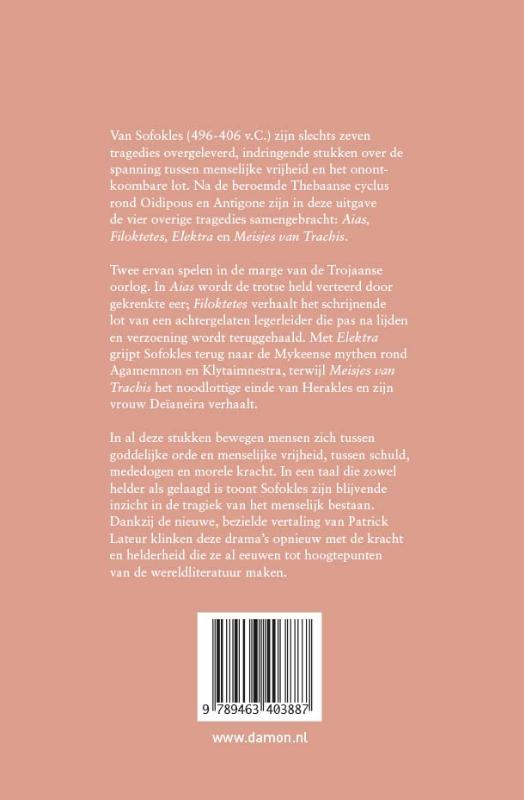 Van Sofokles (496–406 v.C.) zijn slechts zeven tragedies overgeleverd, indringende stukken over de spanning tussen menselijke vrijheid en het onontkoombare lot. Na de beroemde Thebaanse cyclus rond Oidipous en Antigone zijn in deze uitgave de vier overige tragedies samengebracht: ‘Aias’, ‘Filoktetes’, ‘Elektra’ en ‘Meisjes van Trachis’.Twee ervan spelen in de marge van de Trojaanse oorlog. In ‘Aias’ wordt de trotse held verteerd door gekrenkte eer; ‘Filoktetes’ verhaalt het schrijnende lot van een achtergelaten legerleider die pas na lijden en verzoening wordt teruggehaald. Met ‘Elektra’ grijpt Sofokles terug naar de Mykeense mythen rond Agamemnon en Klytaimnestra, terwijl ‘Meisjes van Trachis’ het noodlottige einde van Herakles en zijn vrouw Deïaneira verhaalt.In al deze stukken bewegen mensen zich tussen goddelijke orde en menselijke vrijheid, tussen schuld, mededogen en morele kracht. In een taal die zowel helder als gelaagd is toont Sofokles zijn blijvende inzicht in de tragiek van het menselijk bestaan. Dankzij de nieuwe, bezielde vertaling van Patrick Lateur klinken deze drama’s opnieuw met de kracht en helderheid die ze al eeuwen tot hoogtepunten van de wereldliteratuur maken.’Vier helden’ vormt een tweeluik met ‘Oidipous en Antigone’, waarmee alle overgeleverde tragedies van Sofokles beschikbaar zijn.
