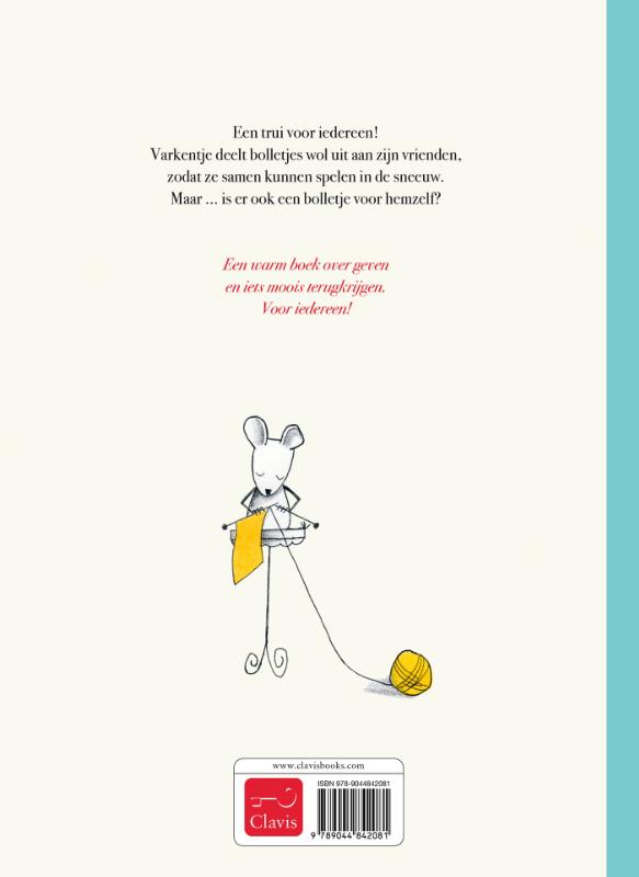 Een trui voor iedereen! Varkentje deelt bolletjes wol uit aan zijn vrienden, zodat ze samen kunnen spelen in de sneeuw. Maar… is er ook een bolletje voor hemzelf?Een warm boek over geven en iets moois terugkrijgen. Voor iedereen!