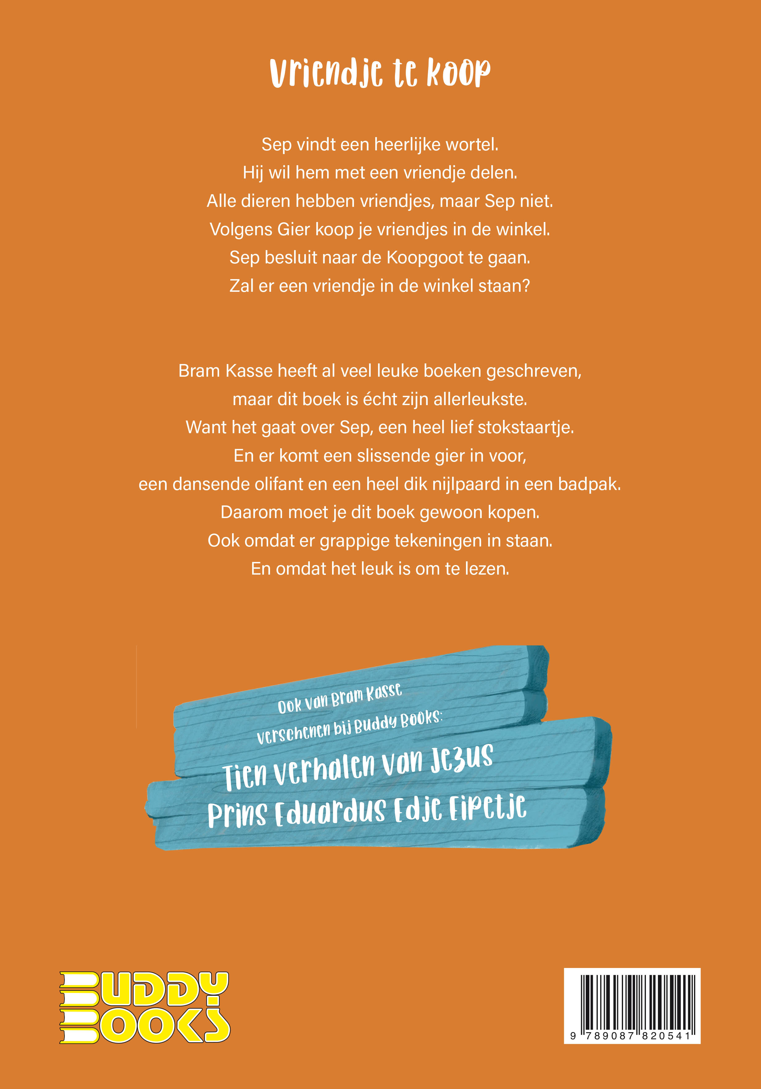 Sep vindt een heerlijke wortel. Hij wil hem met een vriendje delen.Alle dieren hebben vriendjes, maar Sep niet.Volgens Gier koop je vriendjes in de winkel.Sep besluit naar de Koopgoot te gaan.Zal hij in de winkel een vriendje vinden?Bram Kasse heeft al veel leuke boeken geschreven,maar dit boek is écht zijn allerleukste. Want het gaat over Sep, een heel lief stokstaartje. En er komt een slissende gier in voor, een dansende olifant en een heel dik nijlpaard in een badpak. Daarom moet je dit boek gewoon kopen. Ook omdat er grappige tekeningen in staan.En omdat het leuk is om te lezen,of uit voorgelezen te worden. Ook van Bram Kasse verschenen bij Buddy Books:Tien verhalen van JezusPrins Eduardus Edje Eipetje