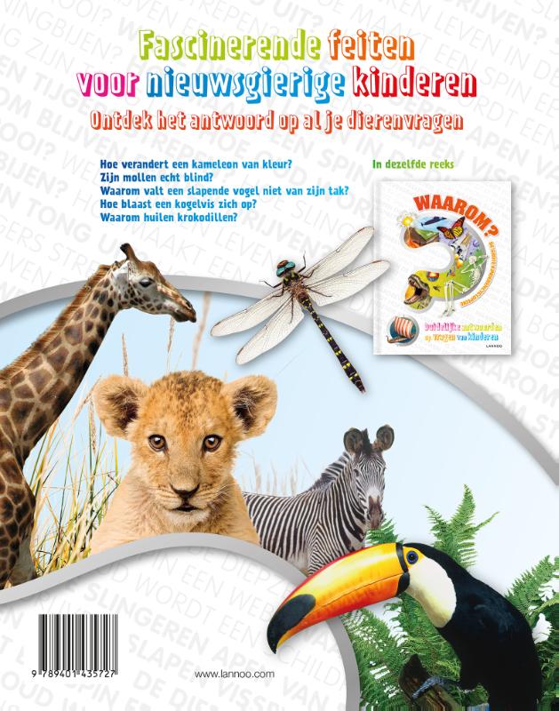 Een vraag- en antwoordboek over dieren voor jonge kinderen ‘Waarom?’ is met stip de favoriete vraag van alle kinderen. Dit fantastische dierenboek geeft nieuwsgierige aagjes het antwoord op de boeiendste vragen. Waarom hebben olifanten grote oren? Zijn mollen werkelijk blind? Slapen vissen? Krijgen spechten nooit hoofdpijn? Huilen krokodillen echt? Een volledig naslagwerk voor kinderen vanaf zeven jaar over dieren van over de hele wereld.