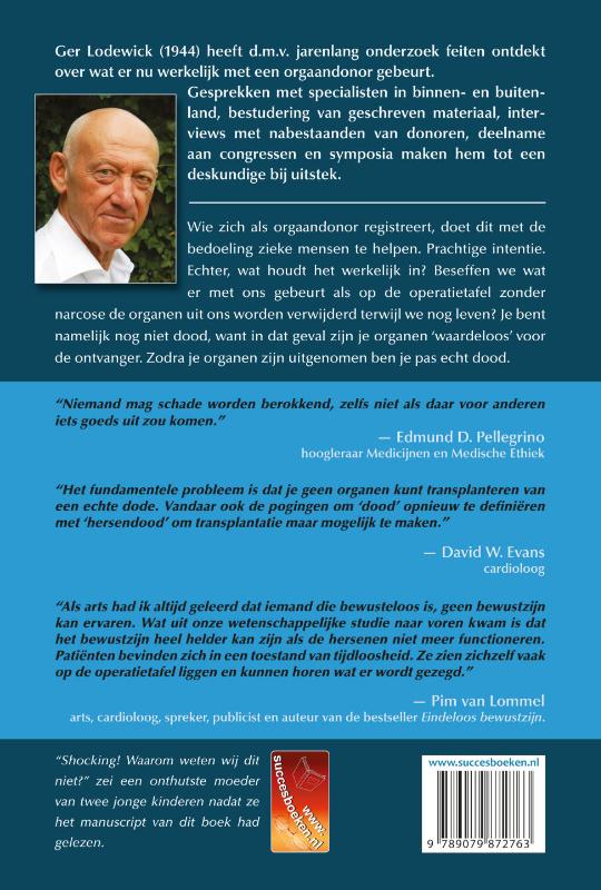 Dit boek is het meest uitgebreide, informatieve boek over orgaandonatie. Voor wie zich wil registreren, zich al heeft geregistreerd, twijfelt of zijn registratie wil veranderen.Niemand kan tegen het helpen van een ernstig ziek medemens zijn. Dat is de reden waarom in Nederland zo’n 3,5 miljoen mensen een ‘ja’ hebben laten registreren op de vraag: “Ben je bereid om na je dood je organen af te staan voor een ziek iemand die hiermee verder kan leven?”Maar deze vraag is niet helemaal correct. Hij zou moeten luiden:”Ben je bereid je organen af te staan, ook als je zeker weet dat je nog leeft, maar wel hersendood bent verklaard, omdat je lichaam (lees hersens) niet meer reageert op bepaalde prikkels? Ben je bereid om je dan zonder narcose open te laten snijden, terwijl de kans groot is dat je alles voelt en je vóór de operatie wellicht nog bij had kunnen komen?”Als de laatste vraag zou worden gesteld zouden weinig mensen zich meer laten registreren en zouden er in het medische circuit bijzonder weinig organen terechtkomen.Duizenden mensen hebben zich op basis van de voortdurende non-informatieve campagnes met de beste bedoelingen laten registreren als orgaandonor. Hún intentie is zuiver. Toen Ger Lodewick met dit boek begon, was zijn drijfveer informatie te verstrekken die voorkomt dat nog meer mensen een besluit nemen op grond van onwaarheid en incorrecte voorlichting, waardoor ze later eventueel met een schuldgevoel door het leven gaan. Met behoud van de compassie met een ernstig ziek mens die een ander orgaan wenst, heeft Ger Lodewick in een jarenlang zoekproces de problematiek van orgaandonatie onderzocht vanuit het perspectief van de donor en diens nabestaanden. In dit onderzoek maakt hij onder andere gebruik van informatie van medische deskundigen als specialisten, anesthesisten, cardiologen, chirurgen, etc. en van gesprekken met familieleden van donoren. De resultaten van zijn onderzoek kunnen confronterend zijn voor wie zich niet of nauwelijks in dit thema heeft verdiept en voor nabestaanden van orgaandonoren. Lodewick beseft dit heel goed en hoopt dat deze mensen dit boek niet als een beschuldiging opvatten. Met de kennis van toen is een registratie tot stand gekomen of een besluit genomen. Deze kennis was gebaseerd op het drijfzand van de onjuiste voorlichting door een aantal specialisten op het gebied van orgaantransplantatie en door de overheid die toestaat dat iemand dood verklaard wordt, die het niet is.Dit boek, met een openhartig en indringend voorwoord van de bekende cardioloog Pim van Lommel (auteur van bestseller Eindeloos bewustzijn), is niet bedoeld als keuzeadvies, maar als informatiebron. Kies zelf met gebruikmaking van alle mogelijke informatie die je ter beschikking staat en laat je niet misleiden door goed geoliede marketingcampagnes.”Niemand mag schade worden berokkend, zelfs niet als daar voor anderen iets goeds uit zou komen.”- Edmund D. Pellegrinohoogleraar Medicijnen en Medische Ethiek”Het fundamentele probleem is dat je geen organen kunt transplanteren van een echte dode. Vandaar ook de pogingen om ‘dood’ opnieuw te definiëren met ‘hersendood’ om transplantatie maar mogelijk te maken.”- David W. Evanscardioloog