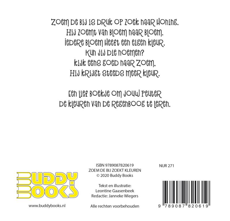Zoem de bij is druk op zoek naarhoning. Hij zoemt van bloem naarbloem. Iedere bloem heeft een eigenkleur. Kun jij die noemen?Een lief boekje om jouw peuterde kleuren van de regenboog teleren.Ook verschenen in deze serie:Wolkje is blijPrecies goed